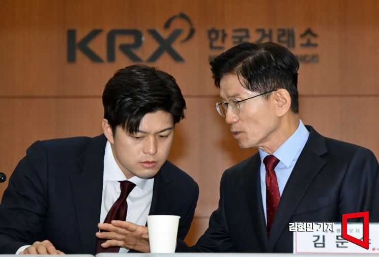 김문수 국민의힘 대선 후보가 22일 서울 여의도 한국거래소에서 열린 중앙선거대책위원회 현장 회의에서 김용태 비상대책위원장과 대화하고 있다. 2025.5.22 김현민 기자