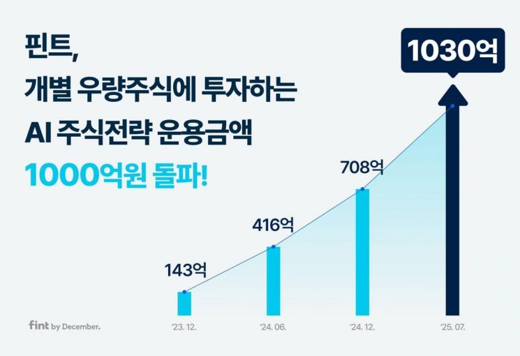 인공지능(AI) 기반 간편투자 서비스 '핀트(fint)'를 운영하는 디셈버앤컴퍼니는 개별 우량주식전략 운용금액이 1000억 원을 돌파했다고 15일 밝혔다. 장기간 안정적인 성과를 축적하며 AI 투자 서비스에 대한 개인 투자자들의 높은 신뢰를 확보한 결과로 풀이된다.