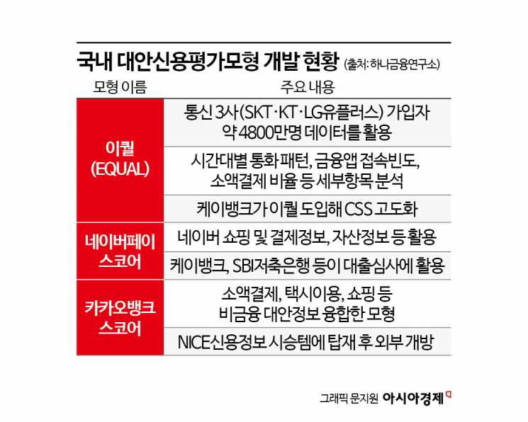 현재 국내에선 핀테크(금융+기술) 기업 중심으로 평가모델을 도입하는 사례가 많다. 통신데이터와 생활정보 등을 활용했으며 인터넷은행이나 제2금융권 등에서 도입하고자 하는 움직임이 많다. 대표적으로 통신 3사(S KT KT close 증권정보 030200 KOSPI 현재가 60,800 전일대비 100 등락률 -0.16% 거래량 73,335 전일가 60,900 2026.04.29 11:31 기준 관련기사 KT '고객보호365TF' 발족…"예방 중심 보호 체계로 전환" 인사권 통제 내려놓은 KT 이사회…박윤영 대표 책임경영 무게 올해 이미 83% 올랐는데 여전히 '저평가'…더 오른다는 종목은[주末머니] ·KT· LG유플러스 LG유플러스 close 증권정보 032640 KOSPI 현재가 16,110 전일대비 360 등락률 -2.19% 거래량 332,953 전일가 16,470 2026.04.29 11:31 기준 관련기사 [르포]"직접 섬까지 와주니 좋지"…LG유플러스, 서해 도서지역 유심 교체 진행 LG유플러스, 유심 무료 교체·업데이트 100만건…교체율 5.9% 류제명 차관 "피지컬AI에 향후 3년 집중투자"…월드IT쇼 개막(종합) ) 데이터를 활용한 이퀄, 네이버페이 스코어, 카카오뱅크 스코어가 있다.