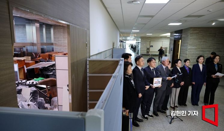 서왕진 원내대표를 비롯한 조국혁신당 의원들이 4일 국회 본청 12.3 계엄군 진입 장소에서 정당해산심판청구 촉구 결의안을 공개하고 있다.