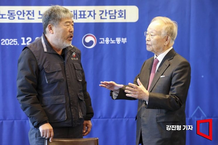 손경식 한국경영자총협회 회장과 김동명 한국노총 위원장이 8일 서울 중구 프레스센터에서 열린 '노동안전 노사정 대표자 간담회'에 참석해 의견을 나누고 있다.