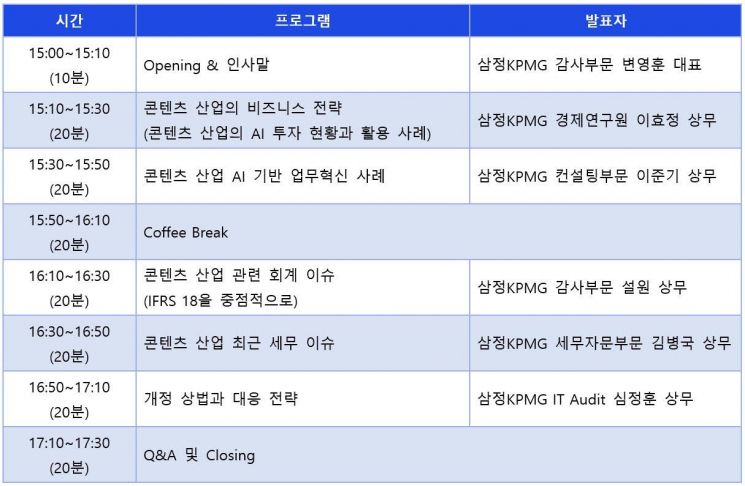 우선 이효정 삼정KPMG 경제연구원 상무가 콘텐츠 산업의 비즈니스 전략과 AI 투자 동향을 설명한다. 이준기 컨설팅 부문 상무는 콘텐츠 산업 내 AI 기반 업무혁신 사례를 소개하며, 설원 감사 부문 상무가 '최근 감리 동향과 IFRS 18 중심의 회계 이슈'를 다룬다. 김병국 세무 부문 상무는 '콘텐츠 산업 최신 세무 이슈'를 제시한다. 이어 심정훈 감사위원회 지원센터 상무가 '개정 상법과 대응 전략'을 주제로 발표를 마무리한다.