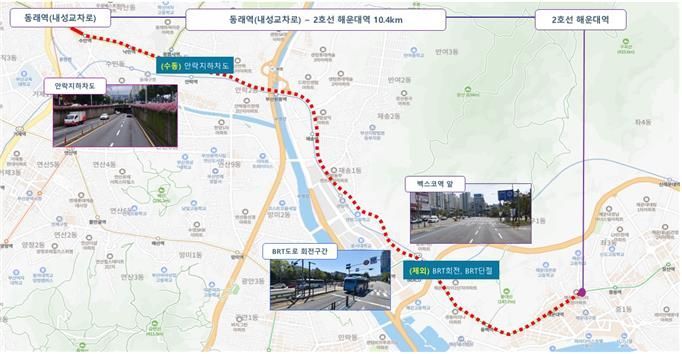 부산시는 이날부터 내성교차로와 중동을 잇는 BRT 구간에서 자율주행버스 심야 여객운송 서비스를 시작한다고 알렸다.