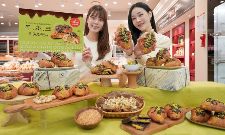 29일 서울 용산구 이마트 용산점 내 베이커리 매장에서 모델들이 신세계푸드가 선보인 가성비 디저트 '두바이 스타일 초코 크루아상(이하 두초크)'를 소개하고 있다. / 신세계푸드 제공