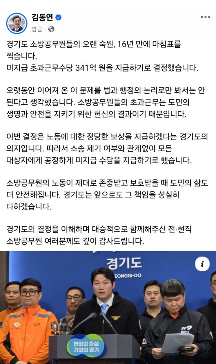 김동연 경기도지사가 소방공무원에 대한 미지급 초과근무수당 341억원을 지급하기로 결정했다며 16년 만에 마침표를 찍었다고 전했다.