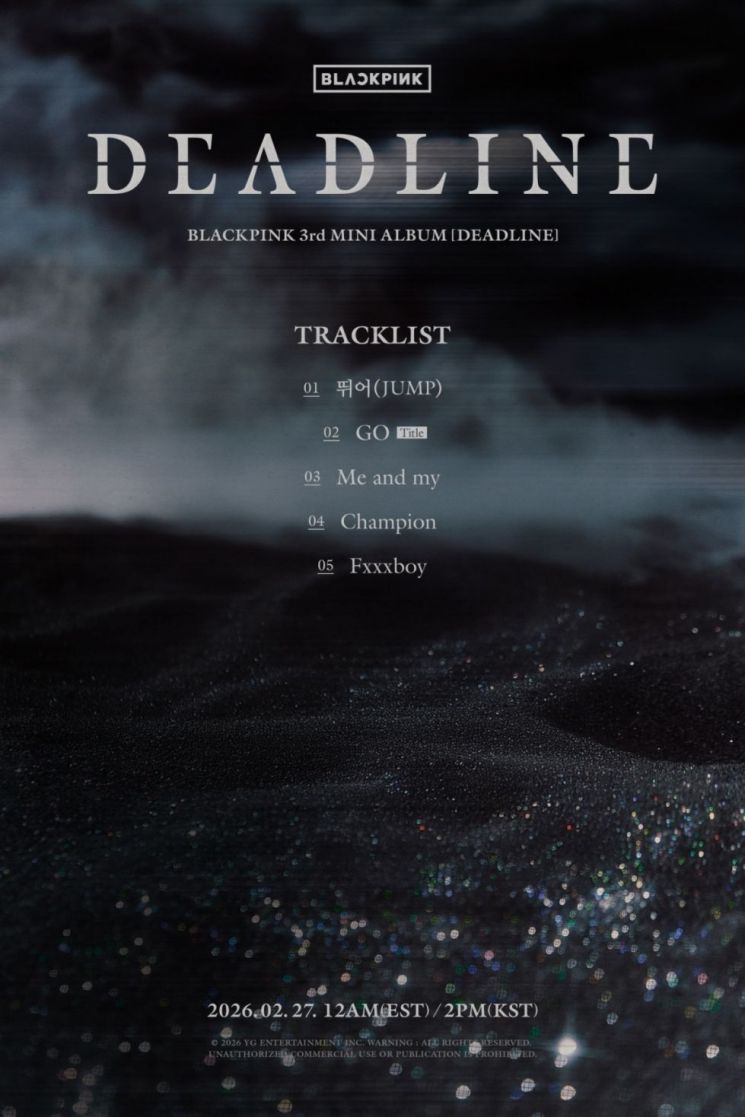 6일 YG엔터테인먼트에 따르면 블랙핑크의 미니 3집 '데드라인(DEADLINE)'은 총 5개 트랙으로 구성했다. 선공개 곡 '뛰어(JUMP)'를 시작으로 타이틀곡 '고(GO)' '미 앤 마이(Me and my)' '챔피언(Champion)' '퍽보이(Fxxxboy)'가 차례로 담겼다.
