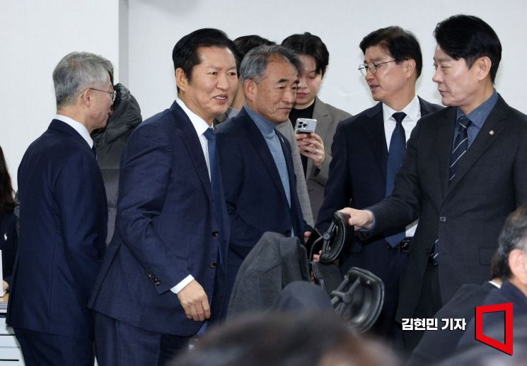 정청래 더불어민주당 대표가 10일 국회에서 열린 조국혁신당과의 합당 관련한 재선의원 간담회에서 참석자들과 인사하고 있다.
