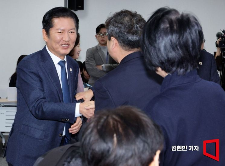 정청래 더불어민주당 대표가 10일 국회에서 열린 조국혁신당과의 합당 관련한 재선의원 간담회에서 참석자들과 인사하고 있다.