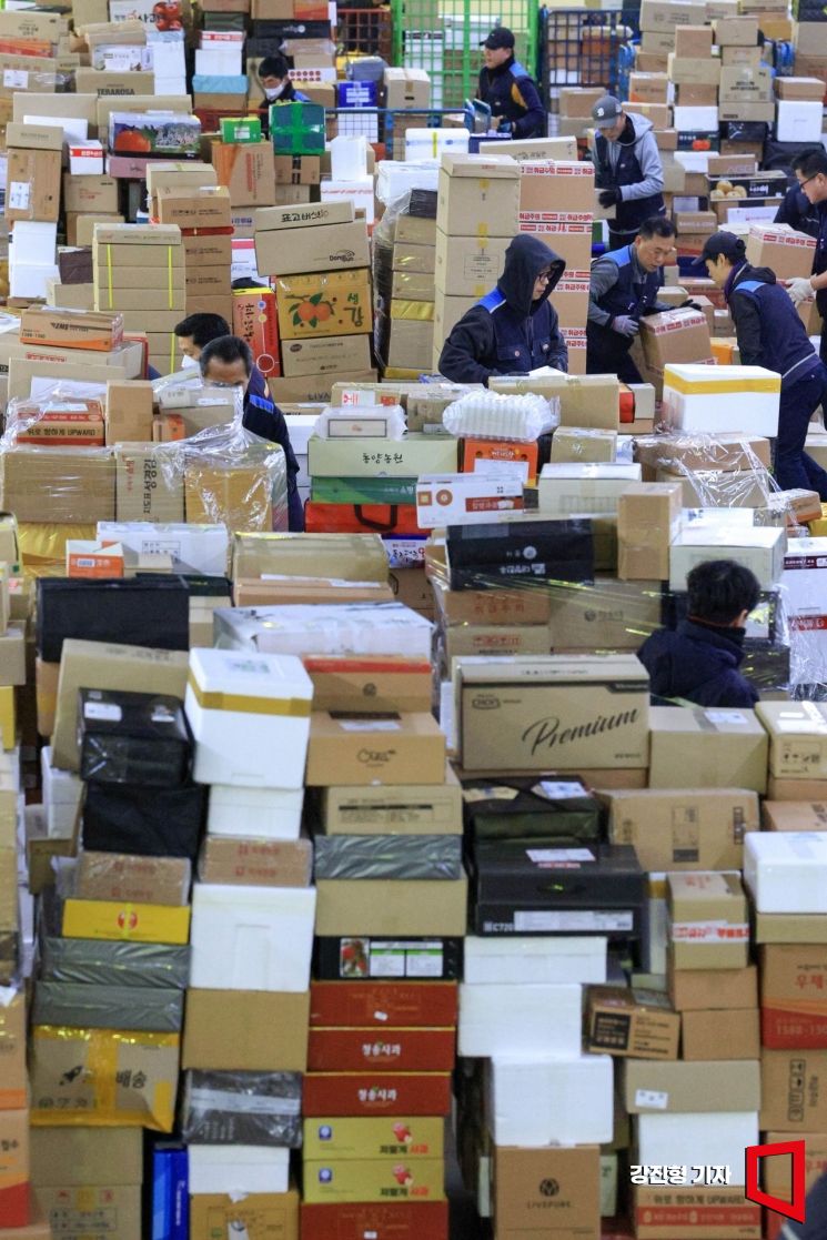 11일 서울 광진구 동서울우편물류센터에서 직원들이 수북이 쌓인 설 명절 소포우편물을 분류 하고 있다. 우정사업본부는 2026년 설 명절을 맞아 오는 20일까지 '설 명절 우편물 특별소통기간'으로 정하고 비상근무체계에 돌입한다.