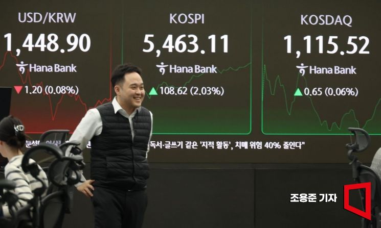 코스피가 장중 사상 최고가를 돌파하며 출발한 12일 서울 하나은행 본점 딜링룸에서 직원이 증시와 환율 등을 모니터하고 있다. 이날 코스피 지수는 전장보다 70.90p(1.32%) 오른 5,425.39에 장을 시작했다.