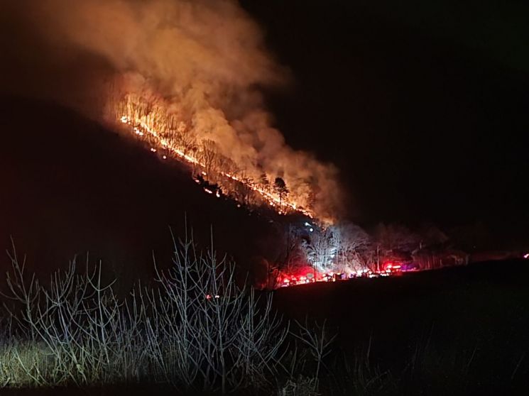 불이 강한 바람을 타고 번지며 산림 당국은 22일 오전 4시 기준 산불 확산 대응 1단계를 발령하고 진화 작업에 총력을 기울이고 있다.
