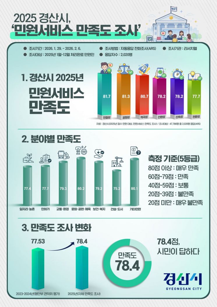 경산시(시장 조현일)가 실시한 '2025년 민원 서비스 만족도 조사'에서 종합 만족도 78.4점을 기록하며 시민들로부터 '만족' 수준의 안정적인 평가를 받았다.