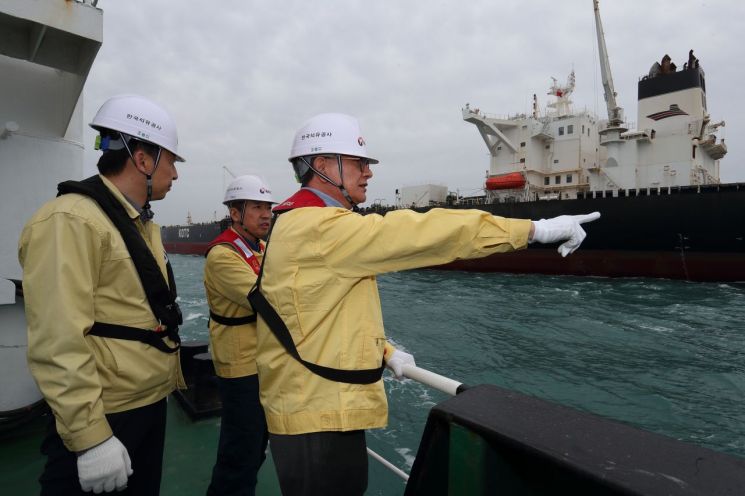 한국석유공사 손주석 사장(오른쪽)이 6일 울산 석유비축기지 현장을 방문해 석유수급 위기상황에 대비한 비축유 방출 대비 태세를 점검하고 있다. 한국석유공사 제공