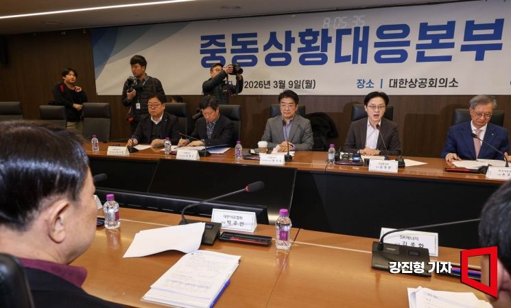 김정관 산업통상부 장관이 9일 서울 중구 대한상공회의소에서 열린 '중동상황대응본부 회의 겸 석유시장 점검회의'에 참석해 모두발언 하고 있다.