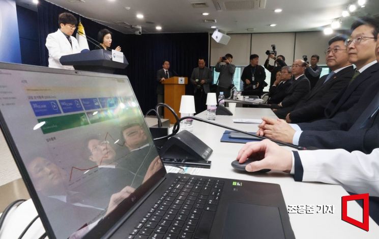 윤호중 행정안전부 장관이 10일 정부서울청사에서 열린 AI 딥페이크 탐지 분석 모델 시연회에서 박남인 국립과학수사연구원 연구관의 선거유세 현장 가짜뉴스 탐지기술 시연을 지켜보고 있다.