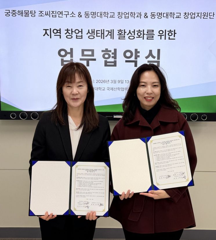 동명대학교가 부산 로컬 기업 '궁중해물탕 조씨집연구소'와 손잡고 지역 창업 생태계 활성화와 학생 창업 실무 교육 확대에 나선다.