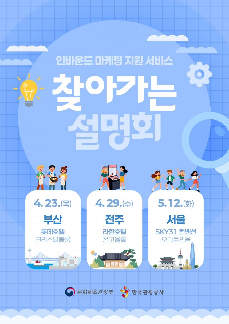 문화체육관광부와 한국관광공사는 외래관광객 유치를 희망하는 업계를 대상으로 '인바운드 마케팅 지원 서비스' 3대 권역별 찾아가는 설명회를 연다고 14일 밝혔다.