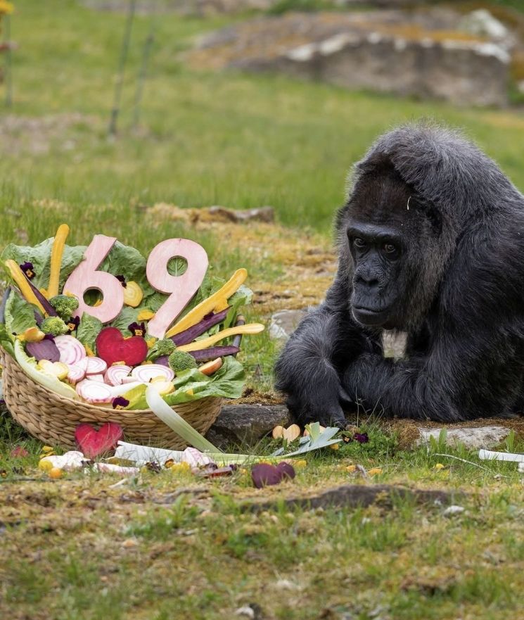 "인간으로 치면 100세 노부인"…세계 최고령 고릴라, 69살 생일잔치 열어