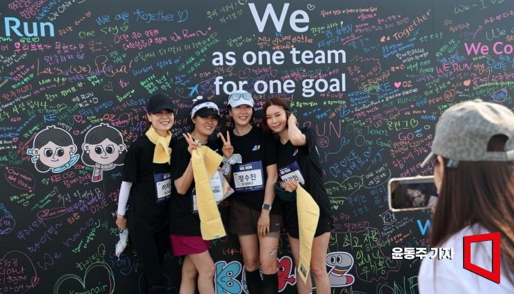 대한항공-아시아나항공 객실승무원 화합 기부 러닝 행사가 14일 인천 영종도 BMW 드라이빙 센터에서 열렸다. 행사에 참석한 양사 직원들이 화합 메세지를 작성 후 기념사진을 찍고 있다.