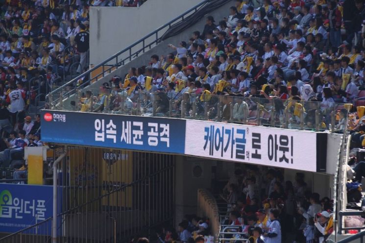 케어가글액은 관중석 LED 전광판을 통해 관람객과 시청자에게 동시에 명확한 메시지를 전달하며 '입속 세균 공격, 케어가글로 아웃'이라는 카피로 구강 내 세균을 효과적으로 관리하는 제품 특성을 강조했다.