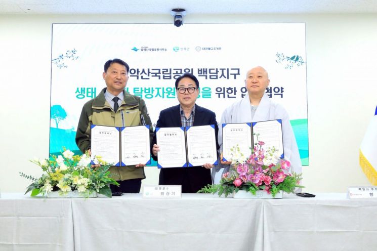 강원도 인제군은 14일 설악산국립공원사무소에서 국립공원공단 설악산국립공원사무소, 대한불교조계종 백담사와 함께 '설악산 백담지구 생태·문화 탐방자원 조성'을 위한 업무협약(MOU)을 체결했다.