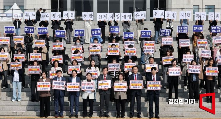 송언석 국민의힘 원내대표를 비롯한 참가자들이 15일 국회 본청 앞 계단에서 특수교육법 개정을 통한 선제적 장애 영유아 유보통합 시행 촉구 대회를 하고 있다.