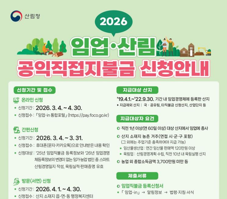 산림청은 오는 30일 '2026년 임업·산림 공익직접직불금(이하 임업직불금)' 신청·접수를 마감한다고 15일 밝혔다.