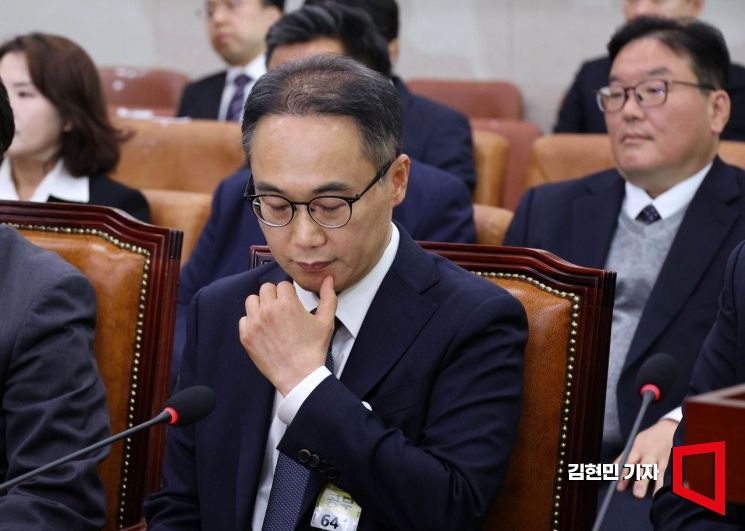 16일 국회 윤석열 정권 정치검찰 조작기소 의혹 사건 진상규명 국정조사특별위원회 제8차 전체회의에서 열린 대장동·김용 전 민주연구원 부원장·위례신도시 조작기소 의혹 사건 청문회에서 이원석 전 검찰총장이 증인으로 출석하고 있다. 오른쪽은 '대장동 2기 수사팀'을 이끌었던 엄희준 검사.