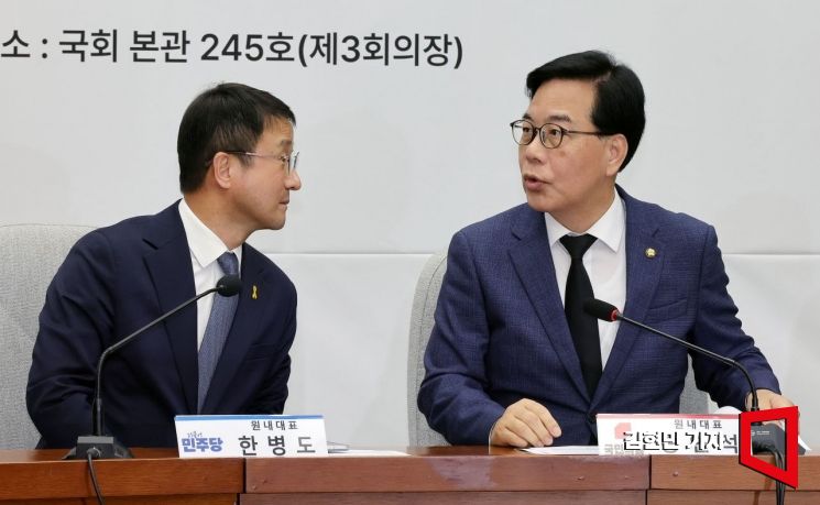 한병도 더불어민주당 원내대표와 송언석 국민의힘 원내대표가 16일 서울 여의도 국회에서 열린 '중동 상황 대응·극복을 위한 더불어민주당·국민의힘 원내대표 긴급 점검 회의'에 대화하고 있다.