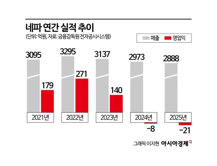24일 업계에 따르면 네파의 지난해 매출은 2888억원으로 전년(2973억원) 대비 약 2.9% 감소했다. 2022년 이후 4년 연속 뒷걸음이다. 같은 기간 영업손실은 21억원으로, 전년(7억6486만원) 대비 약 174% 확대되며 수익성 악화가 더욱 뚜렷해졌다.