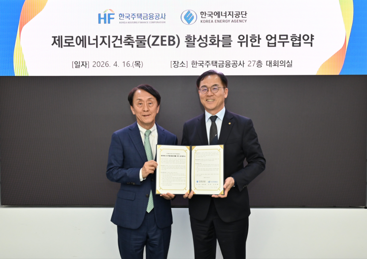 한국주택금융공사(사장 김경환)는 지난 16일 녹색건축물 활성화를 위해 한국에너지공단(이사장 최재관)과 '제로에너지건축물(ZEB) 활성화를 위한 업무협약'을 부산 남구 공사 본사에서 체결했다.