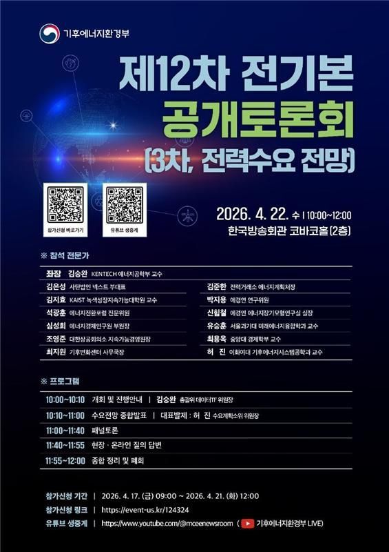 기후에너지환경부와 12차 전력수급기본계획 수립 총괄위원회(위원장 장길수)는 오는 22일 10시부터 서울 양천구 소재 한국방송회관 코바코홀 2층에서 3차 대국민 정책토론회를 개최한다고 밝혔다.