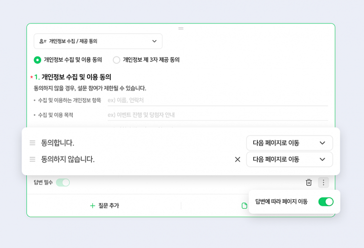 '개인정보 수집·제공 동의' 질문 유형에는 기본 선택 답변으로 '동의하지 않습니다'가 제공되며, 설문 제작자가 필요에 따라 항목을 추가하거나 삭제할 수 있다. 응답 결과에 따라 다른 페이지로 이동하는 분기 기능도 지원돼, 미동의 시 설문종료 또는 별도 안내 페이지 전환 등 동의 절차를 정교하게 설계할 수 있다. 이번 개편은 4월 8일 업데이트 기준 새로 추가하는 질문부터 적용되며, 이미 진행 중인 설문의 기존 질문에는 소급 적용되지 않는다.