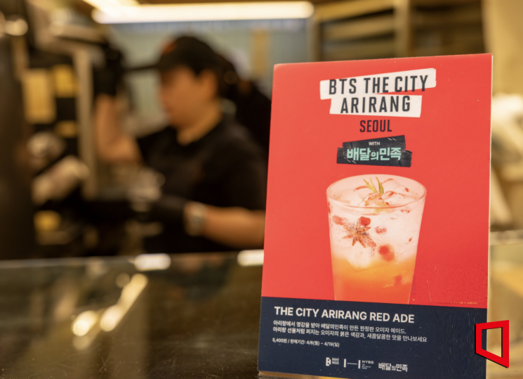 배달의민족은 ‘BTS 더 시티 아리랑 서울’(BTS THE CITY ARIRANG SEOUL)과 연계한 음료 레시피와 원재료를 서울 소규모 카페 100곳에 지원했다. 서울 서촌 인근에서 '더 시티 아리랑 레드 에이드'를 판매하는 카페 모습. 배민