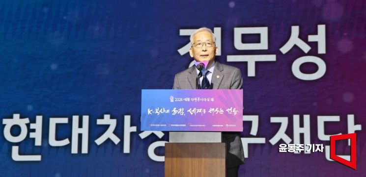 정무성 현대차정몽구재단 이사장이 20일 서울 중구 대한상의에서 열린 '2026 세계 자원봉사자의 해' 기념식에 참석, 축사를 하고 있다.