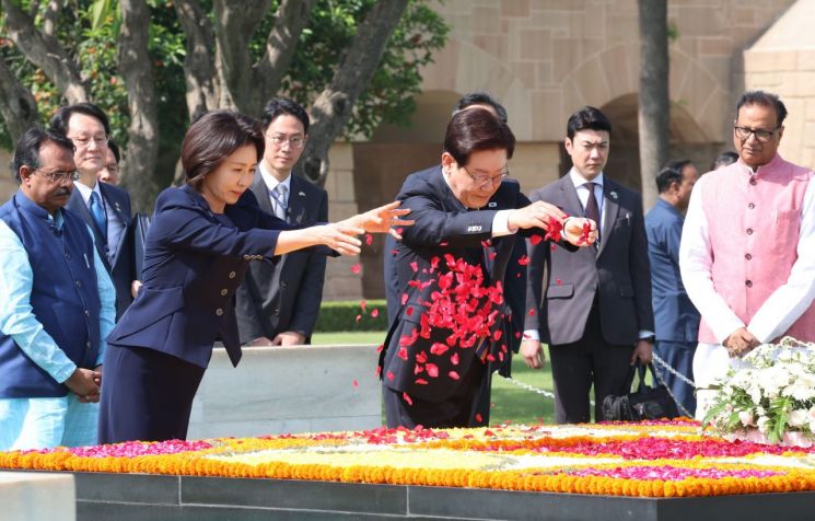 인도를 국빈 방문 중인 이재명 대통령이 20일(현지시간) 마하트마 간디 추모공원을 찾아 헌화했다.