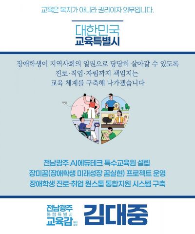 김대중 전남·광주통합특별시 교육감 예비후보가 20일 '장애인의 날'을 맞아 "교육은 복지가 아니라 권리"라는 확고한 원칙을 내세우며 특수교육 관련 핵심 공약을 발표했다.