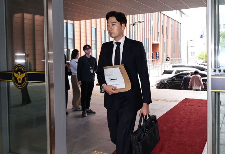 '창원NC파크 사망사고' 유족을 대리하는 이규성 법무법인 해율 변호사가 20일 서울 강남경찰서에서 중대재해처벌법 위반 혐의로 NC다이노스 법인·대표이사 등을 고소하기 위해 민원실로 향하고 있다. 연합뉴스