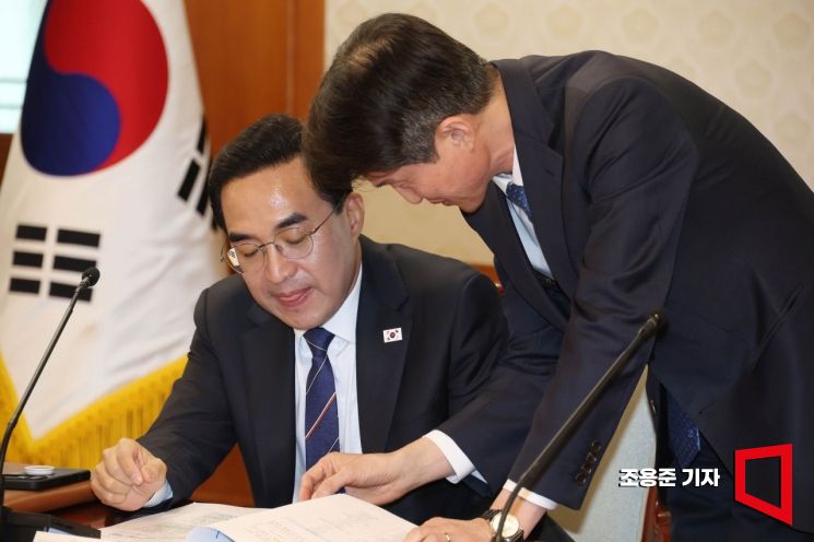 박홍근 기획예산처 장관이 21일 서울 종로구 정부서울청사에서 열린 전남광주통합특별시 출범 준비 점검회의에 참석해 관계자와 대화하고 있다.