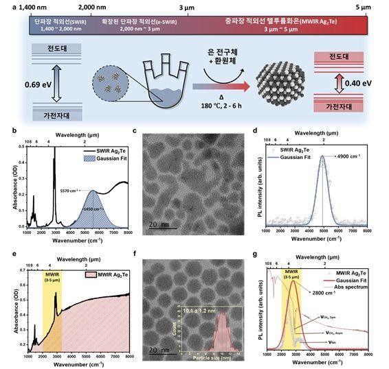 이를 통해 양자점 크기를 기존 한계(약 6nm)에서 최대 10.1㎚까지 키우는 데 성공했고, 감지 파장 역시 단파장 적외선에서 중파장 적외선 영역으로 확장됐다. 특히 흡수 개시 파장은 최대 6.9㎛까지 도달해 중파장 적외선 전 대역 검출이 가능해졌다.