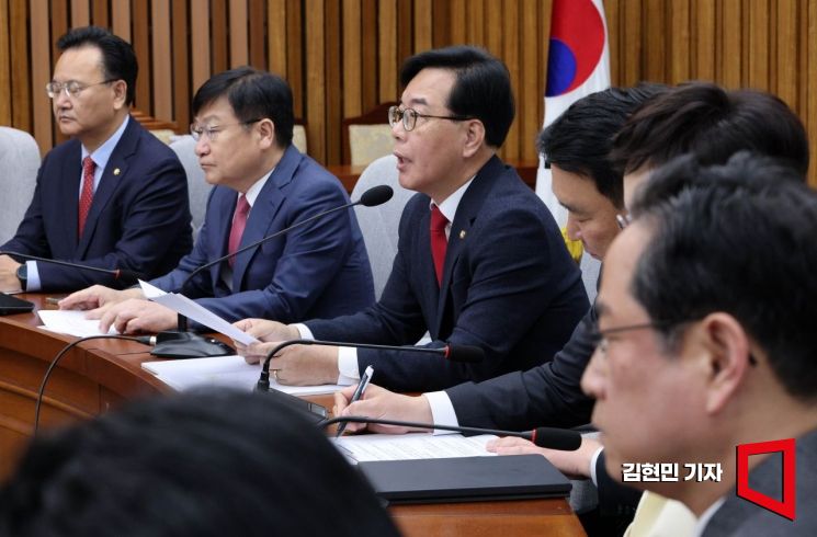 송언석 국민의힘 원내대표가 21일 국회에서 열린 원내대책회의에서 발언하고 있다.