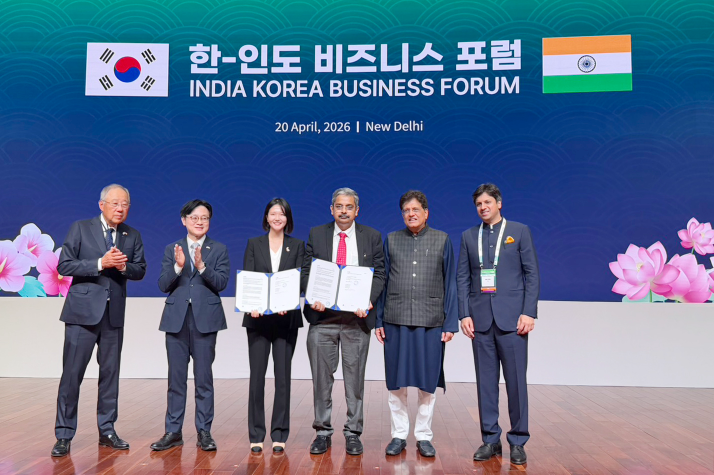 20일(현지시간) 인도 뉴델리 한-인도 비즈니스 포럼에서 진행된 네이버-TCS 양해각서(MOU) 체결식에서 류진 한국경제인연합회 회장(사진 왼쪽부터), 김정관 산업통상부 장관, 최수연 네이버 대표, 우주왈 마투르 TCS 대표, 피유시 고왈 상공부 장관, 아난트 고엔카 인도상공회의소연합회 회장이 기념사진을 찍고 있다. 네이버 제공.