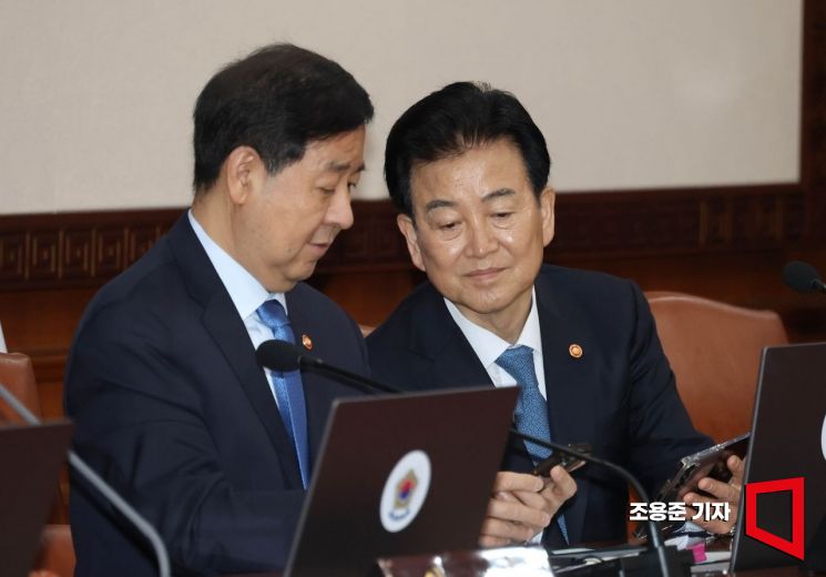 구윤철 경제부총리 겸 재정경제부 장관(왼쪽)과 정동영 통일부 장관이 21일 서울 종로구 정부서울청사에서 열린 국무회의 겸 비상경제본부회의에 참석해 대화하고 있다.