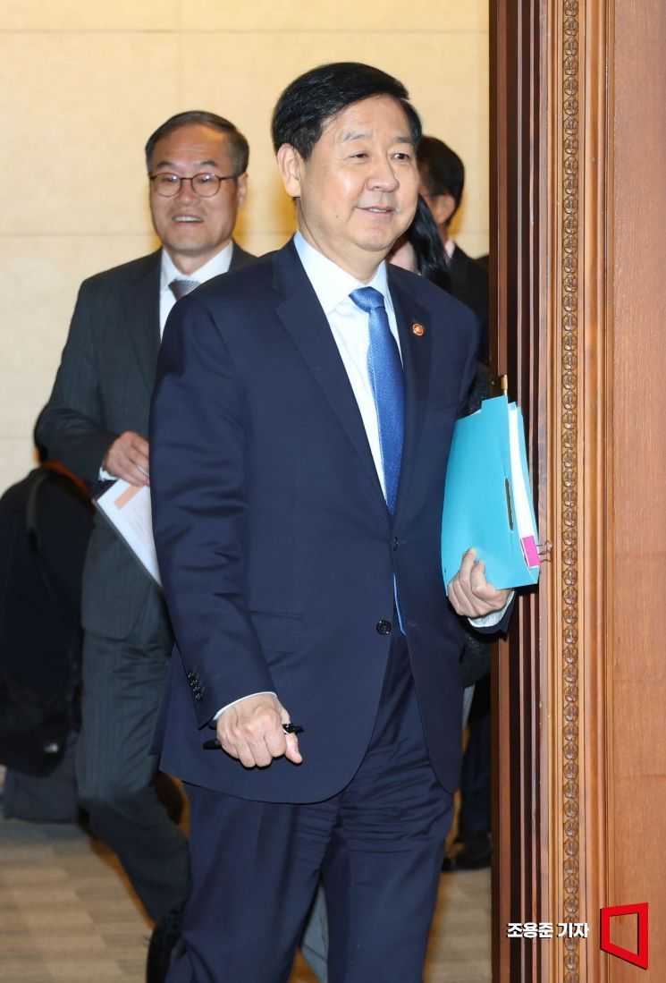 구윤철 경제부총리 겸 재정경제부 장관이 21일 서울 종로구 정부서울청사에서 열린 국무회의 겸 비상경제본부회의에 참석하고 있다.
