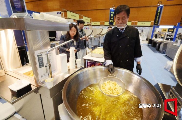 21일 서울 강남구 코엑스에서 열린 2026 우수급식ㆍ외식산업전에 참가한 한 업체 직원이 초음파 인덕션 튀김기로 조리시연을 하고 있다.