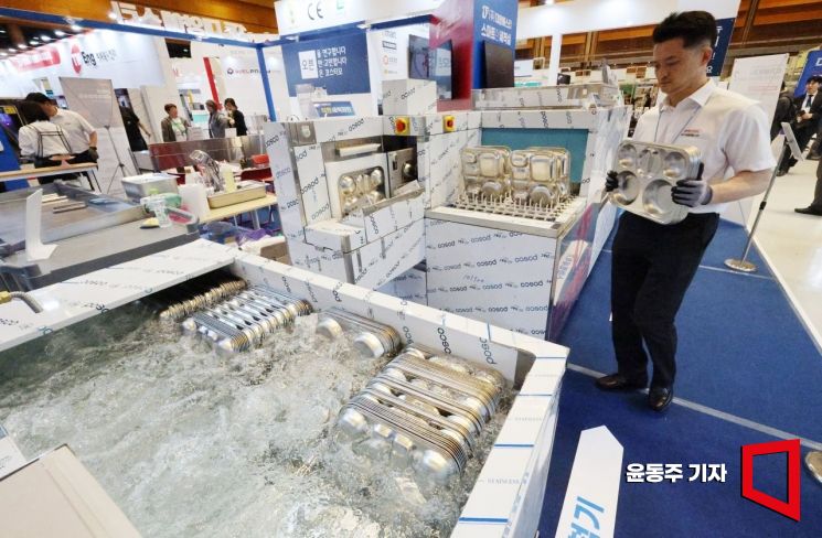 21일 서울 강남구 코엑스에서 열린 2026 우수급식ㆍ외식산업전에서 한 주방용품 관계자가 급식판 자동세척 시연을 하고 있다.