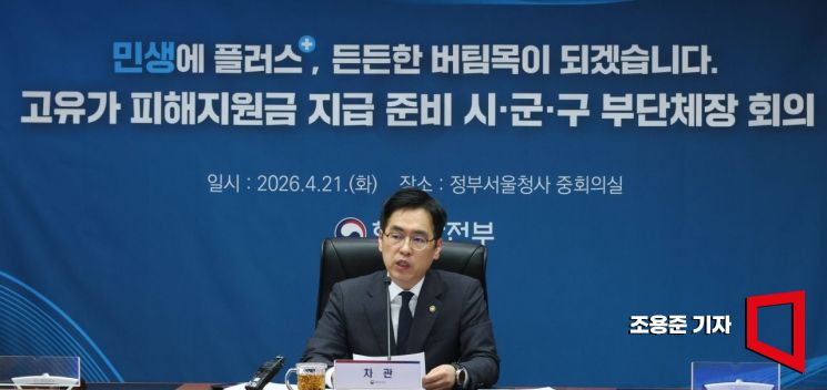 김민재 행정안전부 차관이 21일 서울 종로구 정부서울청사에서 열린 고유가 피해지원금 시군구 준비상황 영상점검회의에 참석해 발언하고 있다.