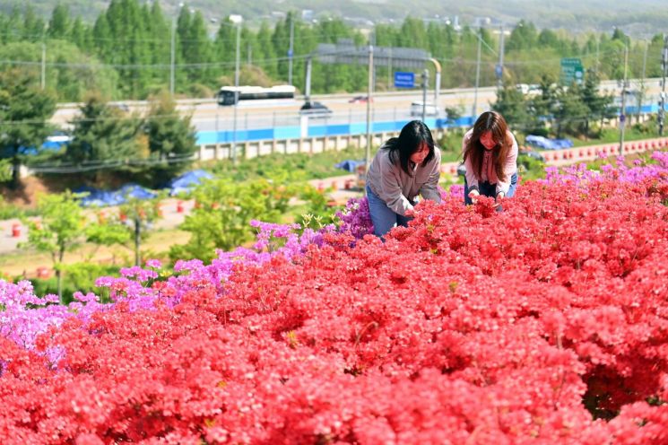 약 1만1000㎡ 부지를 가득 채운 영산홍은 잎보다 꽃이 먼저 피어나는 특성 덕에 빈틈없는 붉은 빛을 선사한다. 꽃길 어디서든 카메라만 대면 '인생 사진'을 건질 수 있다는 입소문이 퍼지면서 인스타그램과 블로그 등 사회관계망서비스(SNS)에서도 반응이 뜨겁다.