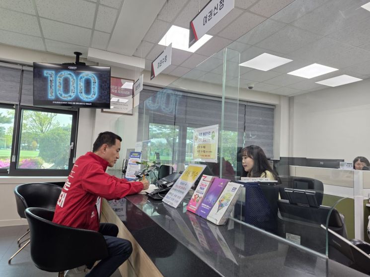 김진태 강원특별자치도지사 후보가 21일 '뚝심 이어달리기 6탄, 그래도 강릉은 김진태' 행보의 일환으로 강릉시 주문진읍에 위치한 강원특별자치도청 제2청사를 민원인 자격으로 상담하고 있다. 김진태 예비후보 제공