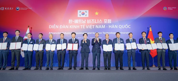 23일(현지시각) 베트남 하노이에서 열린 ‘한-베트남 비즈니스 포럼’에서 김정관 산업통상부 장관(오른쪽 8번째)과 베트남 응오 반 뚜안 재무부 장관(오른쪽 7번째)이 참석한 가운데 두산에너빌리티 윤요한 마케팅부문장(오른쪽 3번째)이 베트남 현지 기업인 PTSC, PETROCONs와 각각 베트남 신규원전 협력과 공급망 개발을 위한 업무협약을 체결했다. 두산에너빌리티
